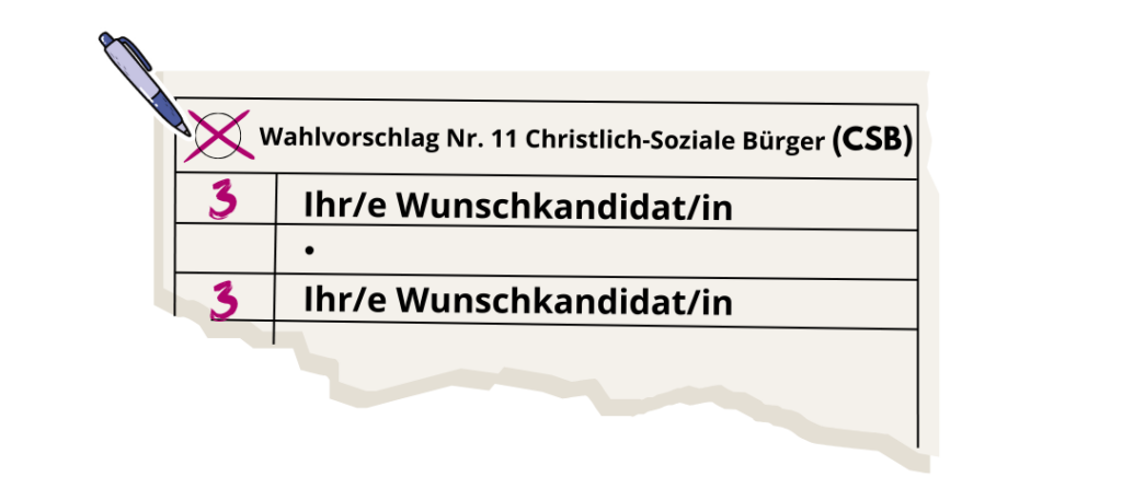 Für die Wahl des Stadtrats können Sie maximal 50 Stimmen vergeben. Wenn Sie die Liste der CSB ankreuzen, geht für unsere Wählergemeinschaft keine Stimme verloren. Sie haben zudem die Möglichkeit, Ihre Stimmen auf einzelne Kandidaten der CSB zu verteilen. Pro Kandidaten dürfen Sie bis zu drei Stimmen vergeben.